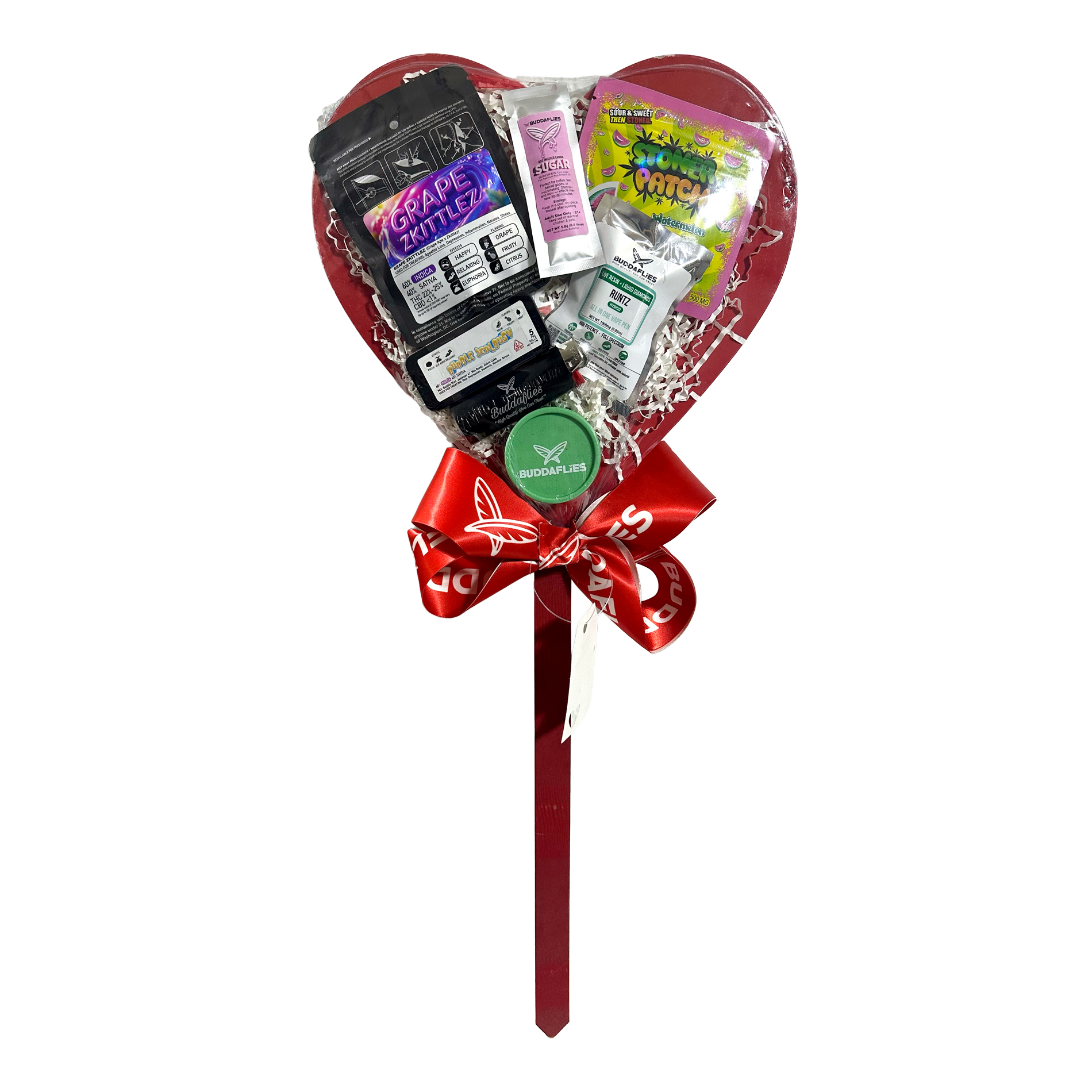 Includes Grape Zkittlez 3.5g flower, Watermelon Gummies, CannaSugar, Bubble Jealousy 5-pack prerolls, Runtz disposable, plus grinder and lighter.
