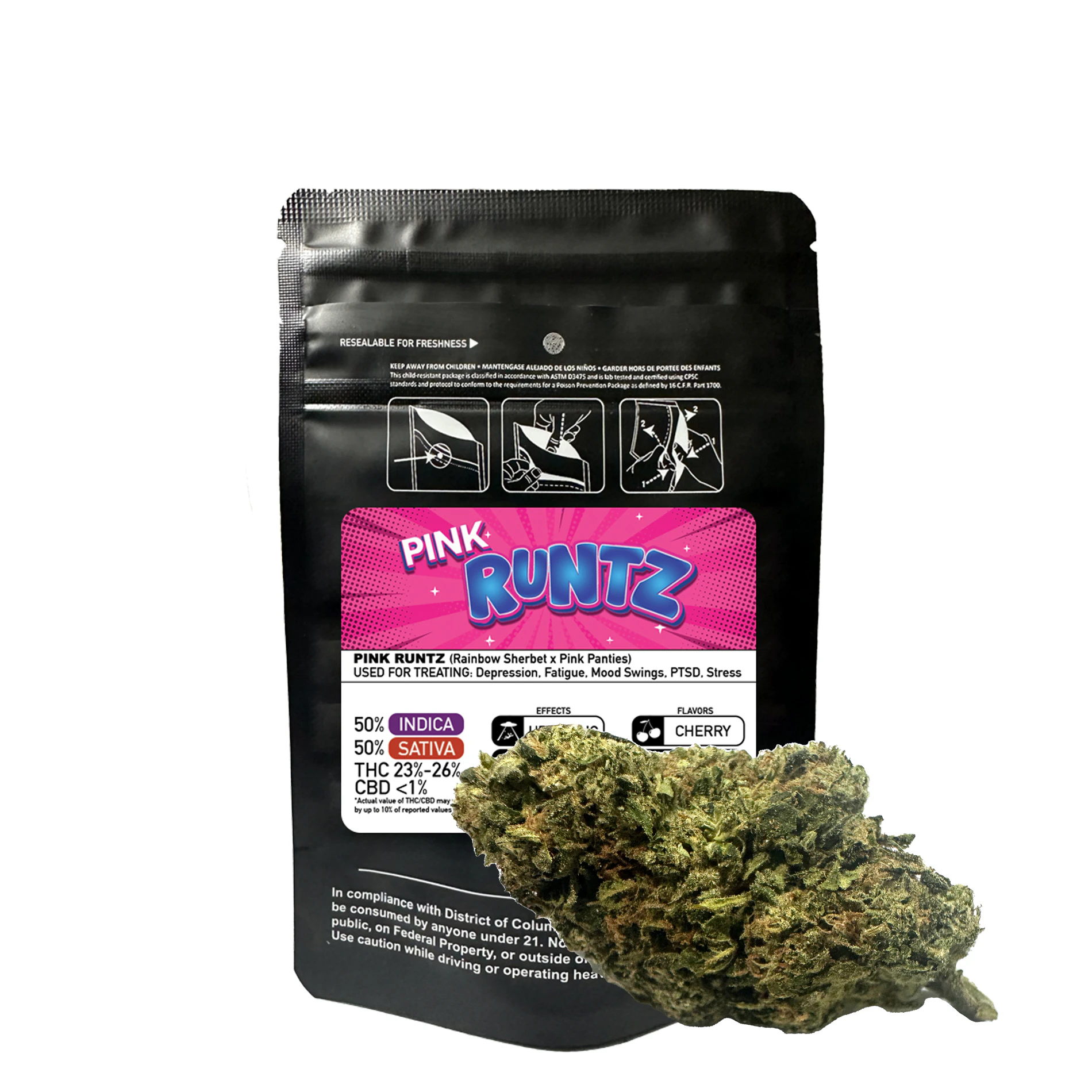 Pink Runtz, a perfectly balanced 50% Indica/50% Sativa hybrid from Rainbow Sherbet x Pink Panties. With cherry, fruity, and sweet flavors, this strain delivers uplifting, happy, and relaxing effects with a potent 23%-26% THC, making it a flavorful go-to for any vibe.
