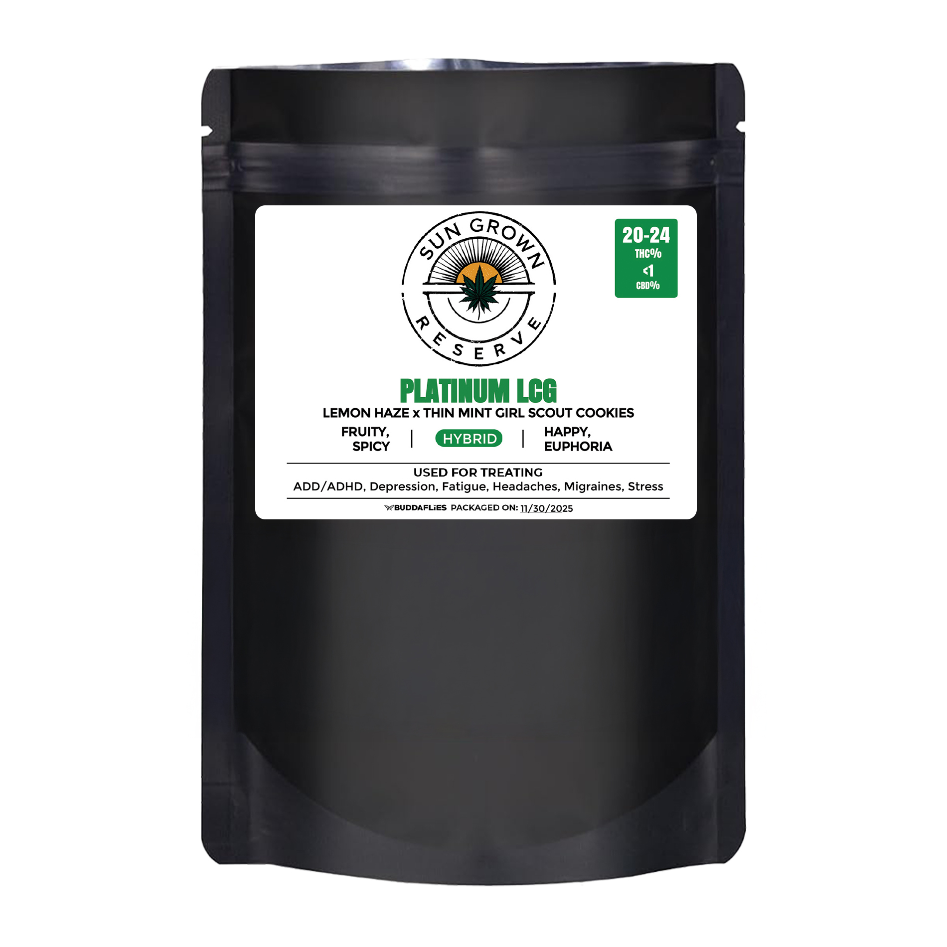 PLATINUM LCG is a sun-grown reserve hybrid blending Lemon Haze x Thin Mint Girl Scout Cookies, testing at 20–24% THC. It delivers a bright, happy euphoria that lifts mood and keeps things light. Flavor-forward with fruity notes layered over a subtle spicy finish, this strain offers a smooth, uplifting experience with depth.