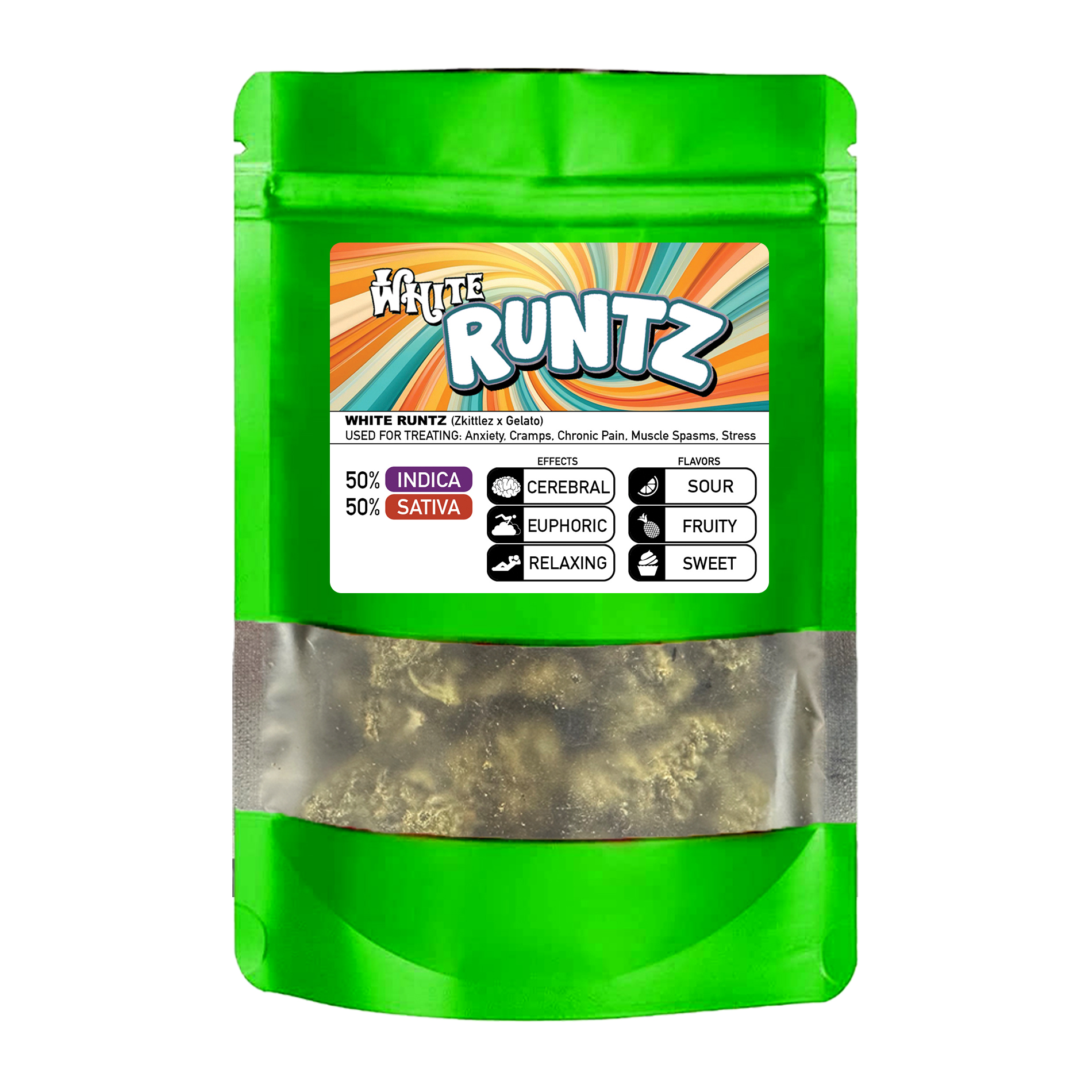 White Runtz is a balanced hybrid celebrated for its creamy, candy-sweet flavor and frosty trichomes. This 1oz pack delivers smooth smoke, long-lasting euphoria, and a mellow body high.